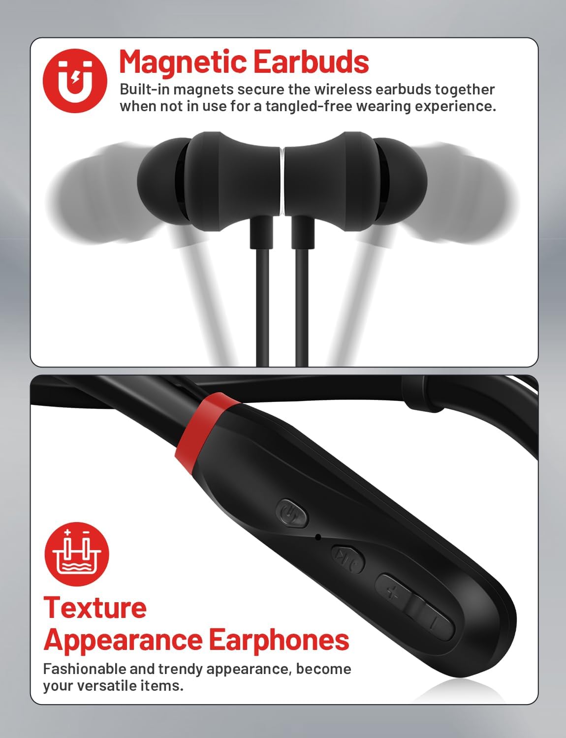 MAGNETIC & NECKBAND DESIGN: Magnetic self -absorbing design can effectively prevent the headphones from being lost or wrapped, convenient for storage and movement, and more lasting. The lightweight U -shaped silicone neck circle uses a popular process to make it more fashionable and novel. Bluetooth Earbuds are also equipped with extra 3 pairs of soft earplugs for personalised fit. Ergonomic design, comfortable and soft, very suitable for daily use.