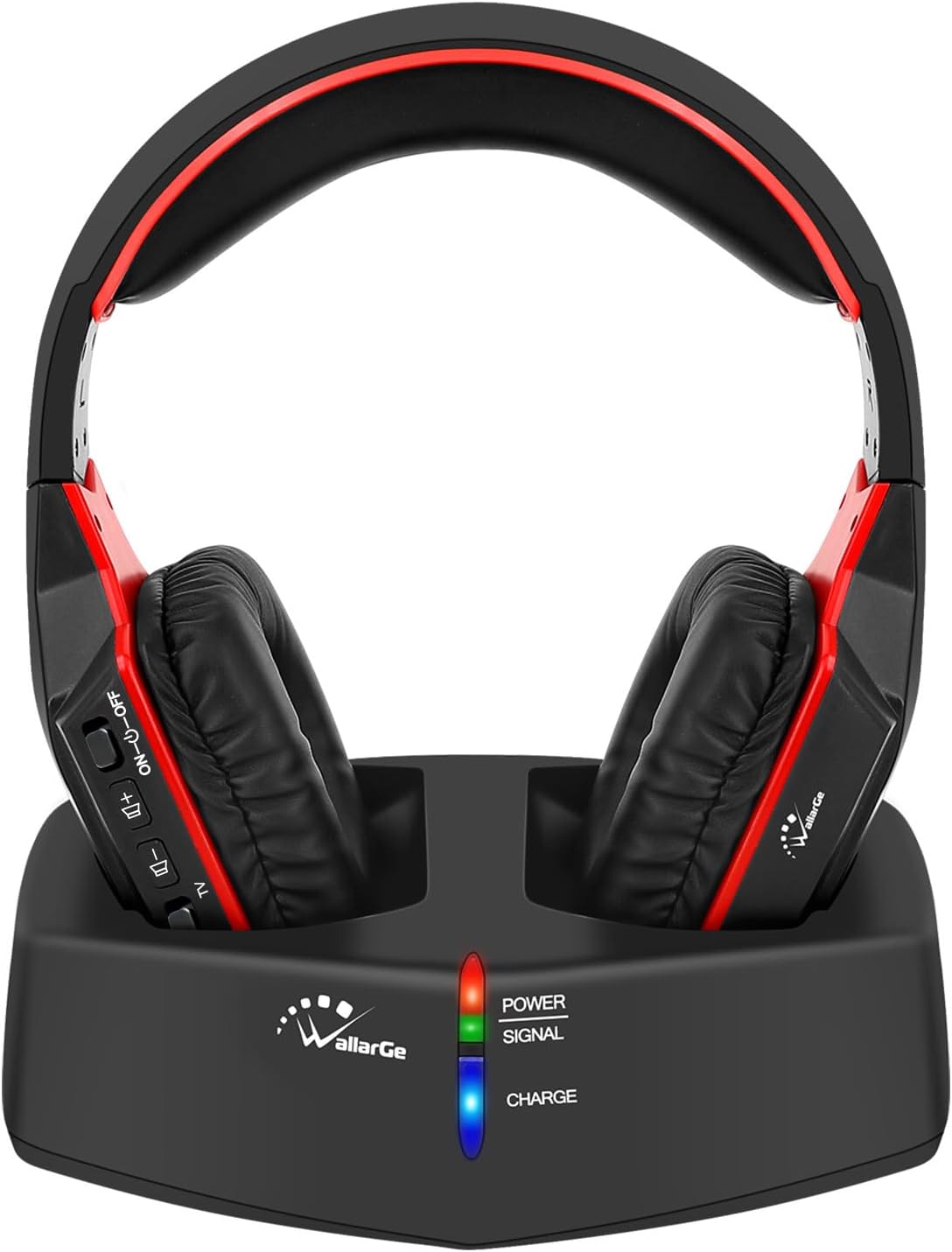 WallarGe Wireless Headphones for TV Watching with RF Transmitter Charging Dock, Plug and Play, 100 Ft Wireless Range, Rechargeable 20 Hour Battery (Black with Red)