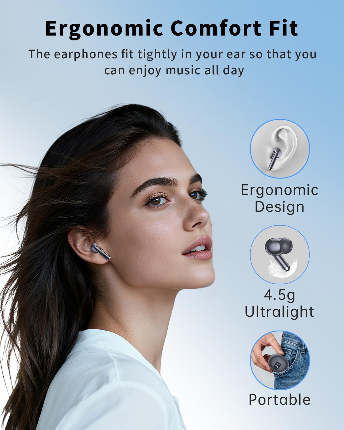 Comfortable to Wear: This wireless earbuds have an ergonomic shape and come with a variety of sizes of earcups so can fit comfortably in our ears